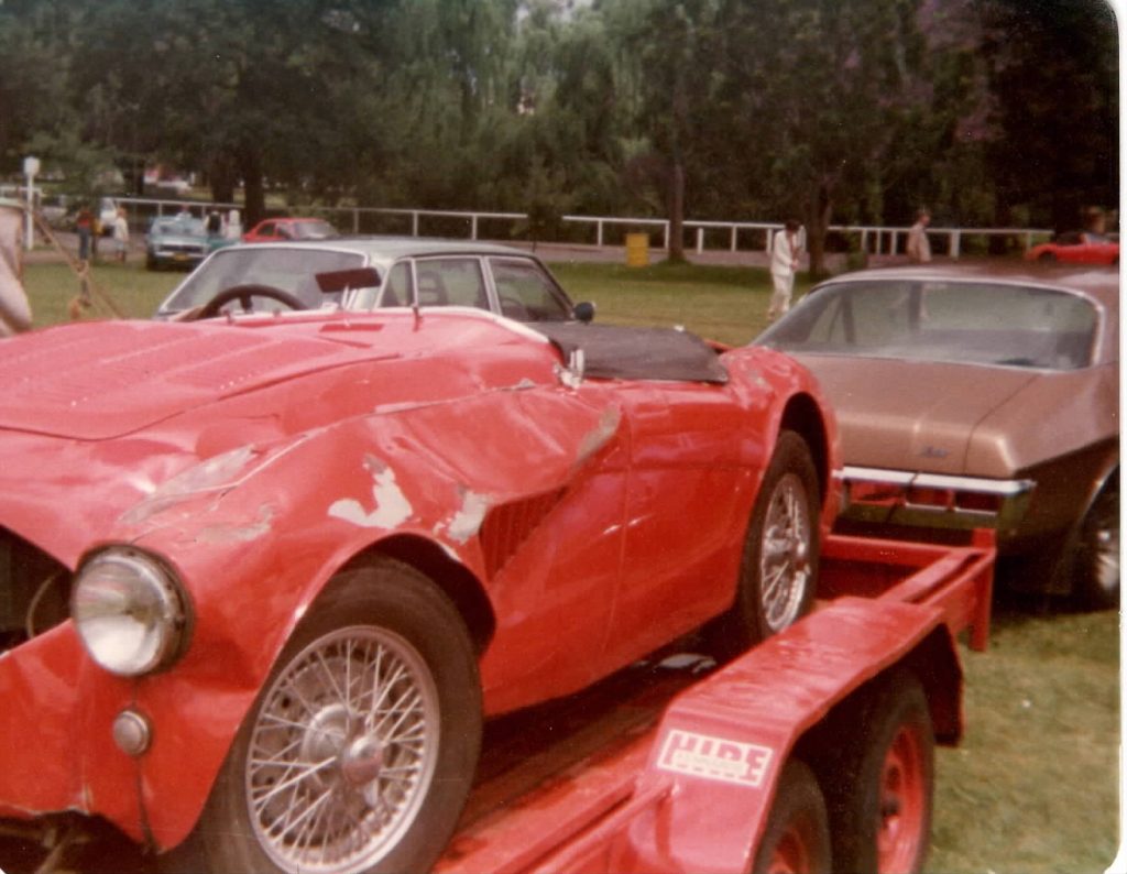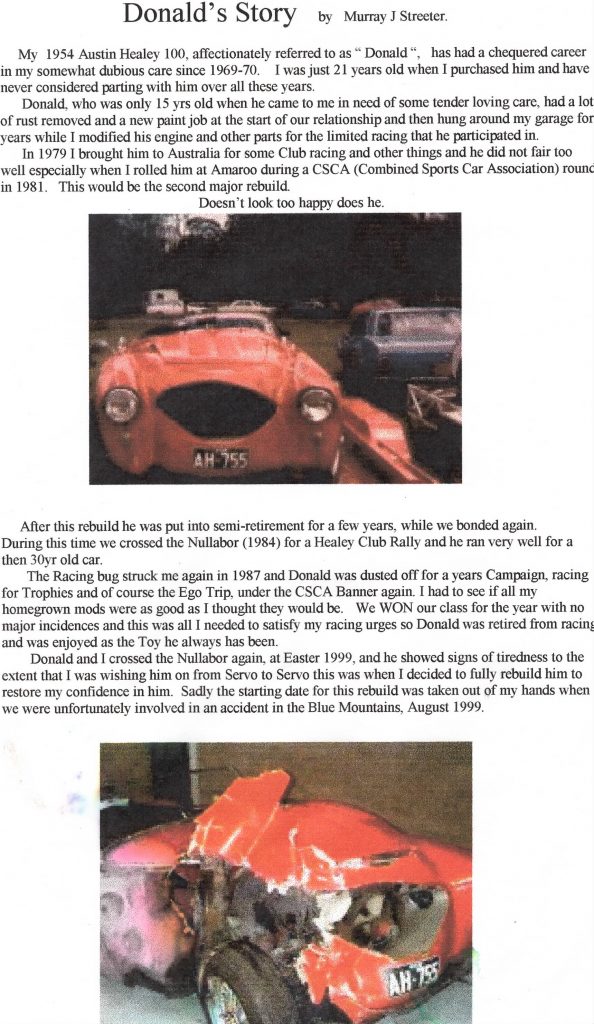 Some salvageable parts were later used, and what we also figure another wrecked Healey he acquired to become the 100S Replica that he fully rebuilt ground up, of course, actively referred to as what we knew; as ‘Donald.’